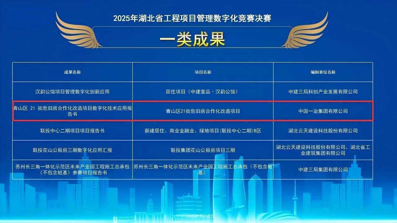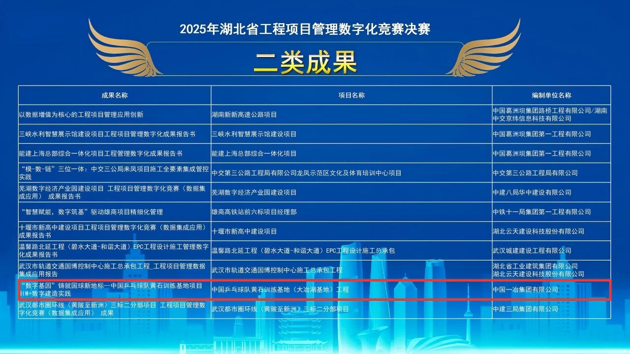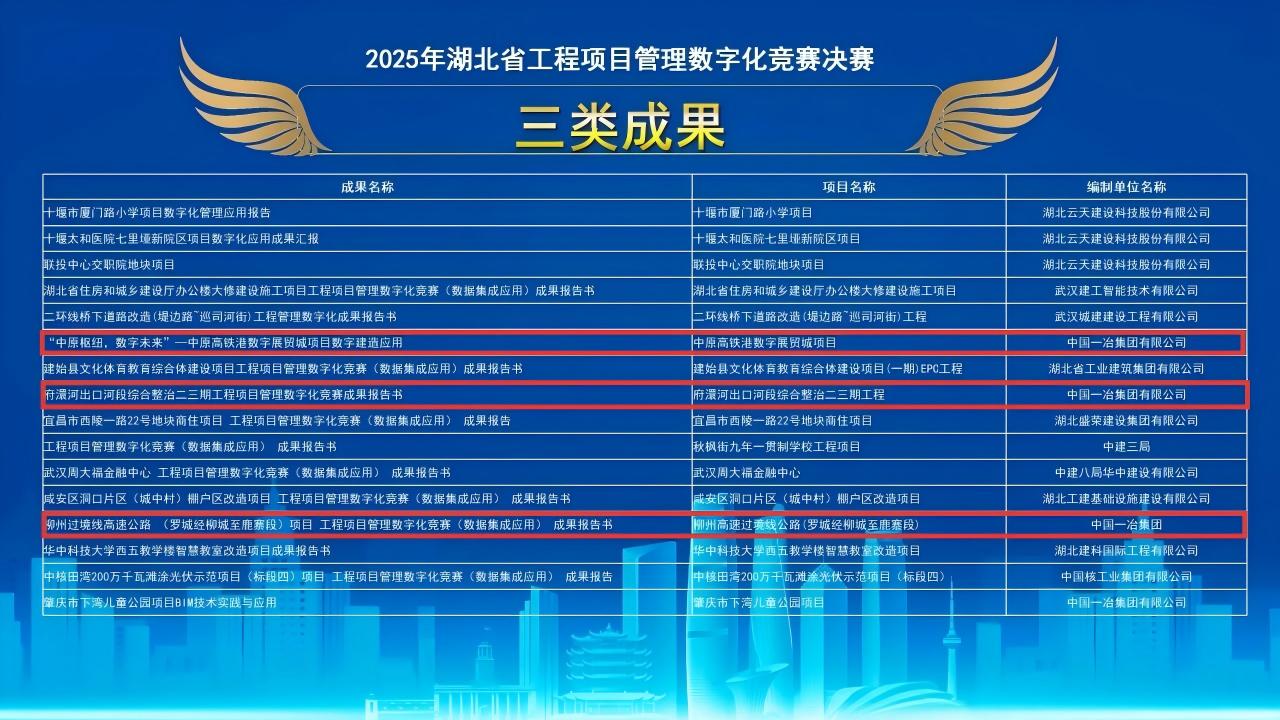 青山区21街危旧房合作化改造项目数字技术综合应用凭借对危改工程全流程的数字化赋能,有效提升了项目质量与效率,成功斩获一类成果。中国乒乓球队黄石训练基地项目BIM+数字建造实践,以BIM技术为核心,实现了体育场馆建造的精细化管理,荣获二类成果。中原高铁港数字展贸城项目、府澴河出口河段综合整治二三期工程、柳州过境线高速公路(罗鹿段)项目分别在交通枢纽建造、生态环境治理、高速公路管理等领域实现数字化技术创新应用,获评三类成果。